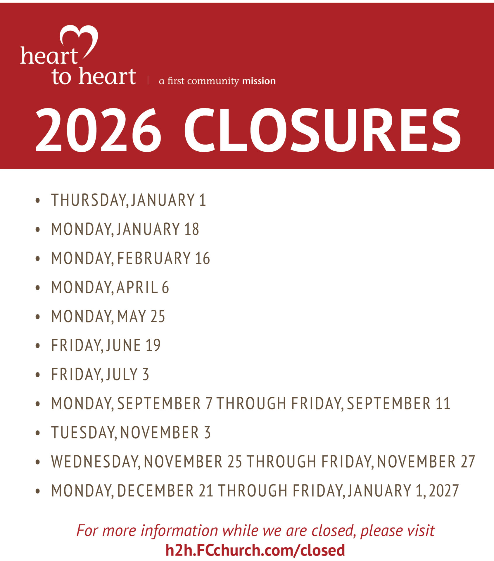 While closed, staff will not be monitoring Heart to Heart email or voicemail.
