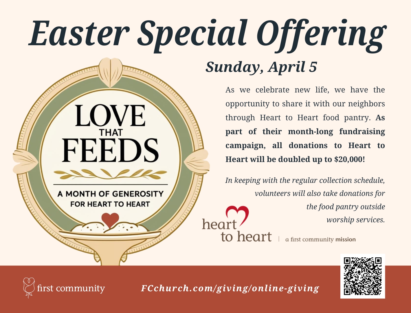 At First Community Church, the offering taken during worship each Easter Sunday is designated for a specific mission. Heart to Heart has been named as the recipient this year. These contributions will be received during our matching campaign, so they will be doubled!