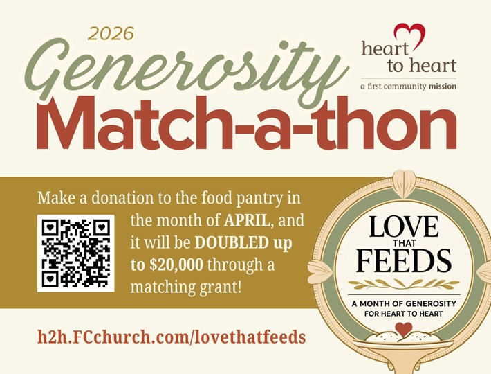 To take advantage of this opportunity to double your generosity, make a contribution by check or online! Checks should be made out to “First Community Church”. Please indicate in the memo field, or include a note, that the donation is for Heart to Heart. You can mail or drop off a check at: