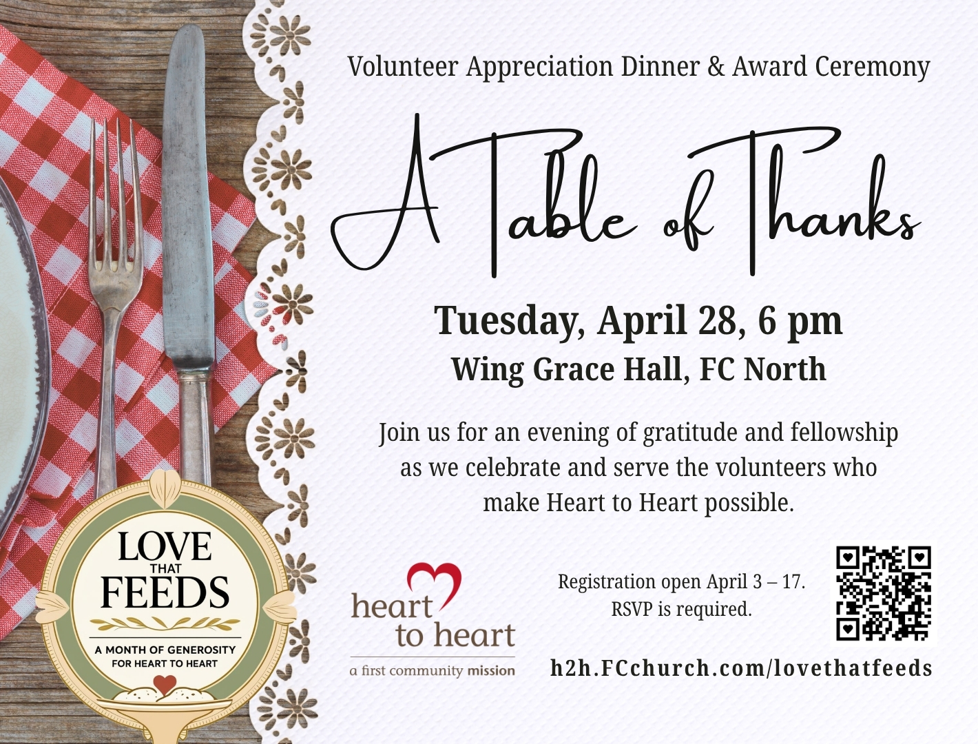 Because love feeds our neighbors, we gather to feed one another. Join us for an evening of gratitude as we celebrate the volunteers who make Heart to Heart possible.