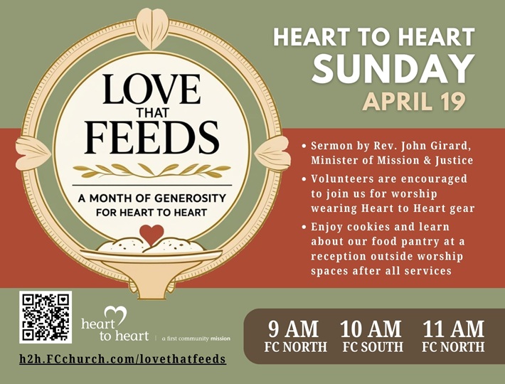 On Sunday, April 19, you’re invited to join us at any First Community worship service. During the service, we will celebrate Heart to Heart and hear a sermon from Rev. John Girard, Minister of Mission & Justice. Volunteers are encouraged to wear their red Heart to Heart gear. After the service, all are welcome to join us for a refreshments outside worship spaces. Enjoy cookies and coffee, meet staff, and learn more about the work of our food pantry.